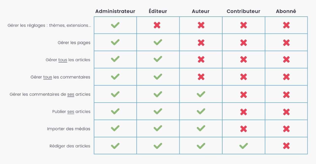 – Contributeur : Peut écrire et gérer ses propres articles mais ne peut pas les publier